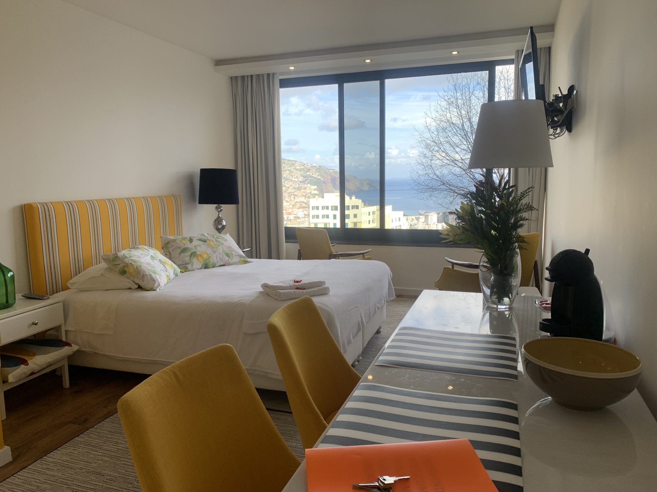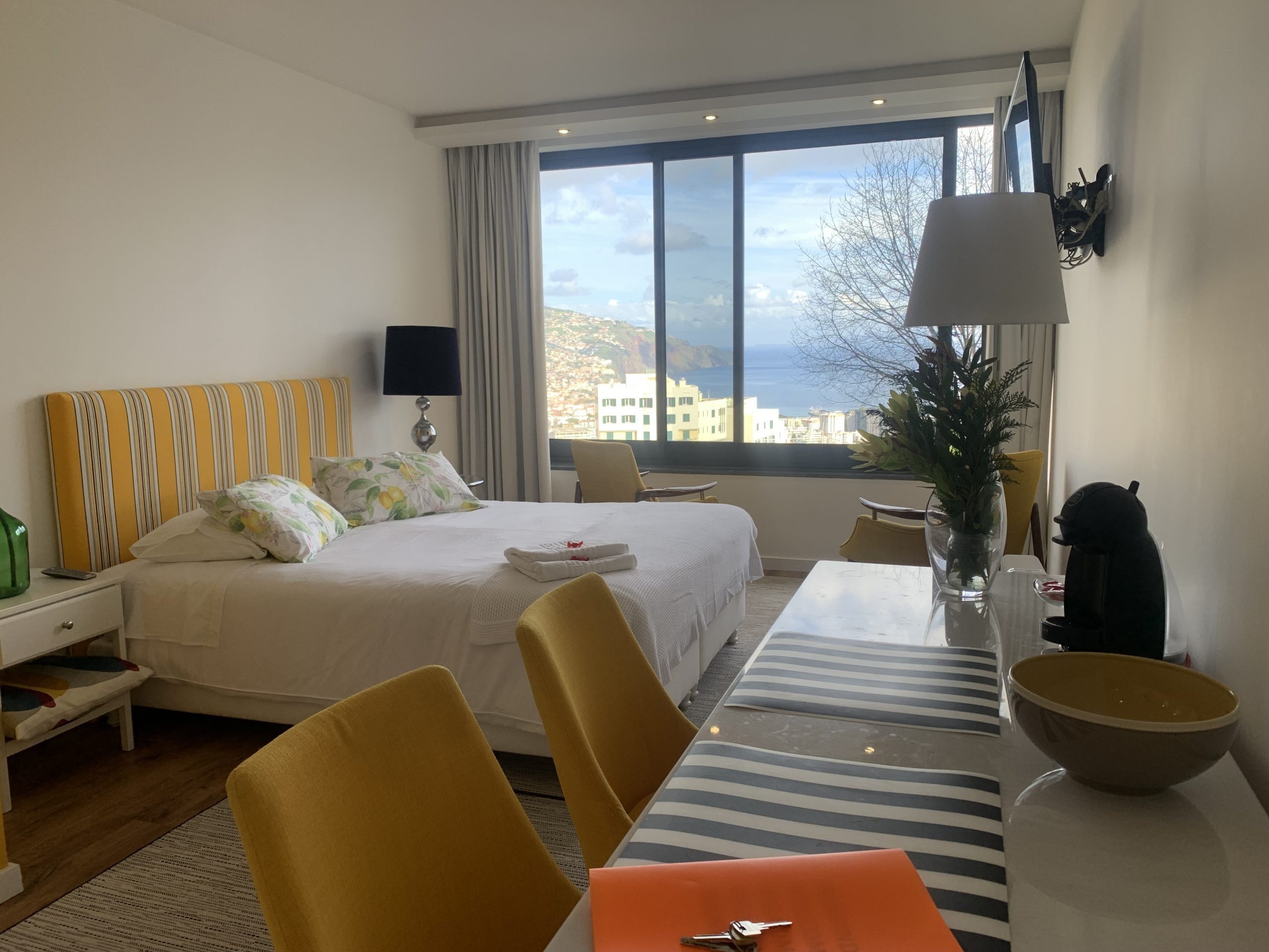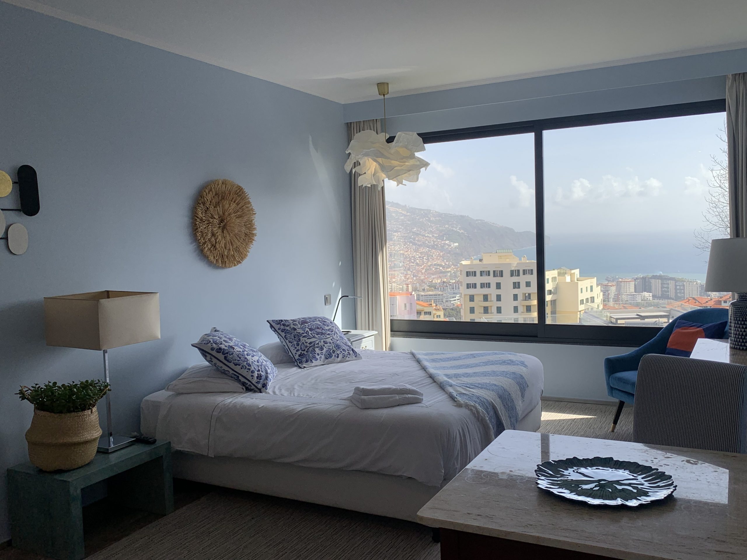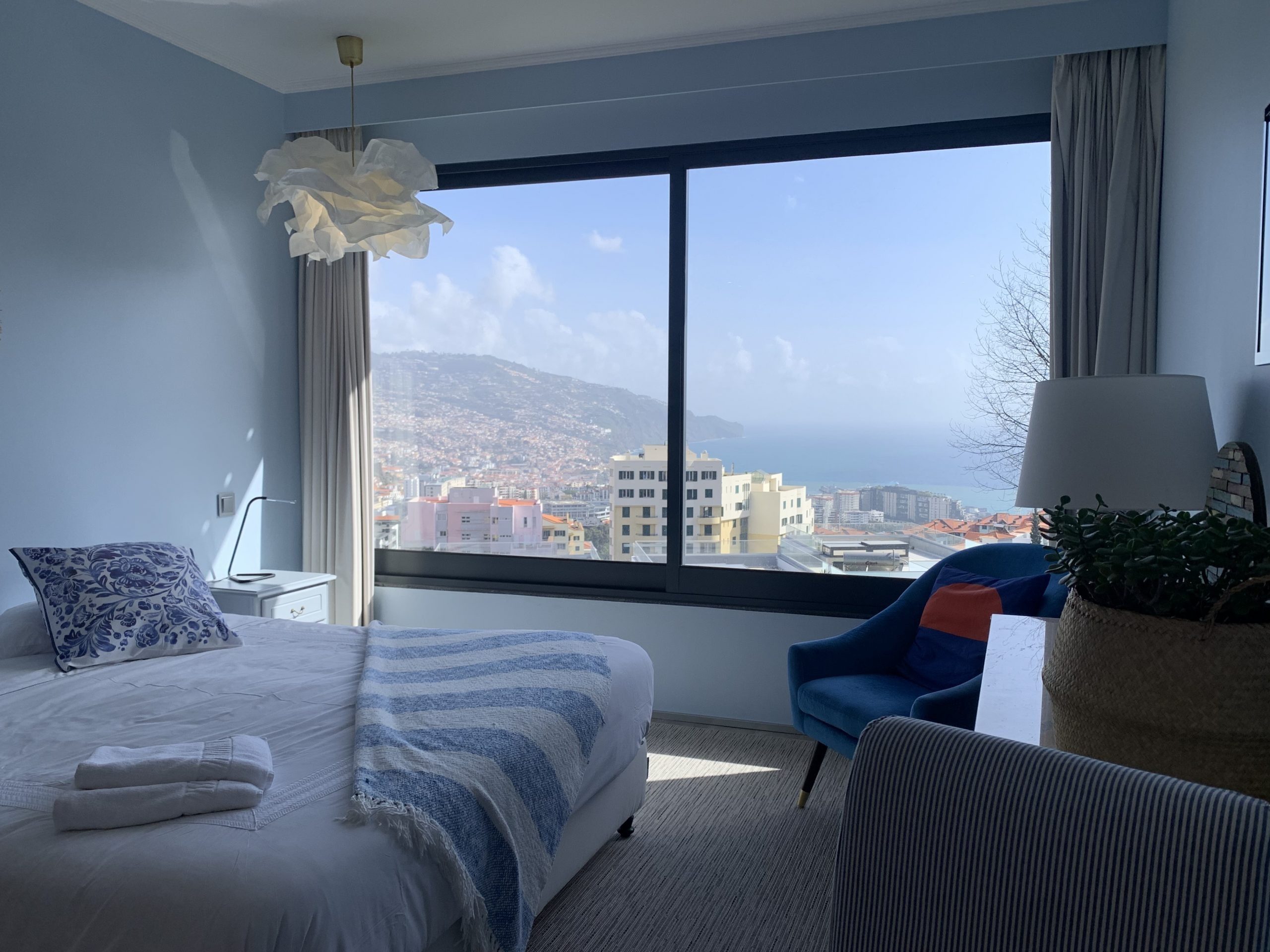 This 80 sq metres apartment is very bright and spacious. It has direct access to the garden and a superb view over Funchal and the ocean. Living room, kitchen, bathroom with walk-in shower and a separate bedroom with a queen size bed make this apartment ideal for all our guests and very popular for long stays.
