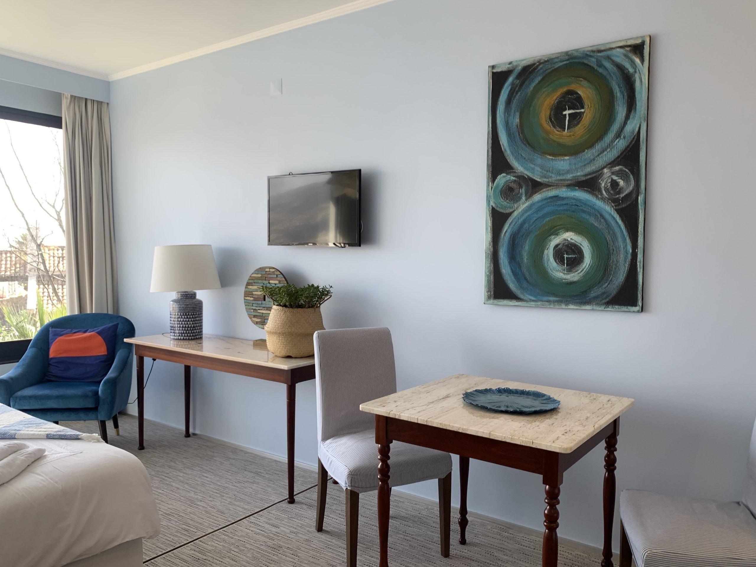 This panoramic studio-apartment with its large windows, offers fabulous views over the ocean and the garden. There is also a balcony with table and chairs where you can enjoy your breakfast or meal. Kitchenette has all the necessary kitchen utensils.