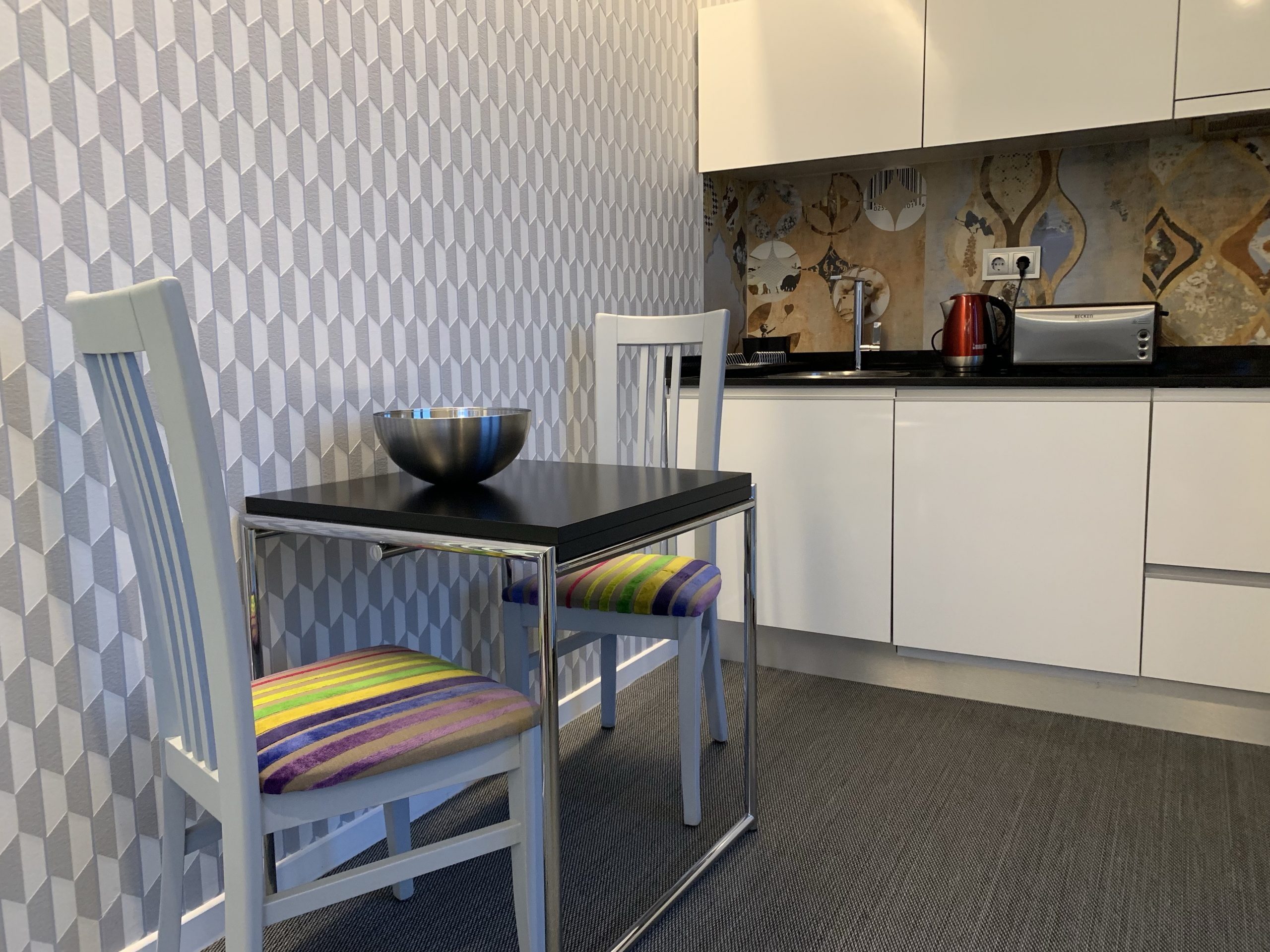The deluxe studio apartment gives direct acess to the garden and offers a terrace in a very private area of the property. There is a separate dining area/kitchenette. Bathroom has a walk-in shower and bidet.